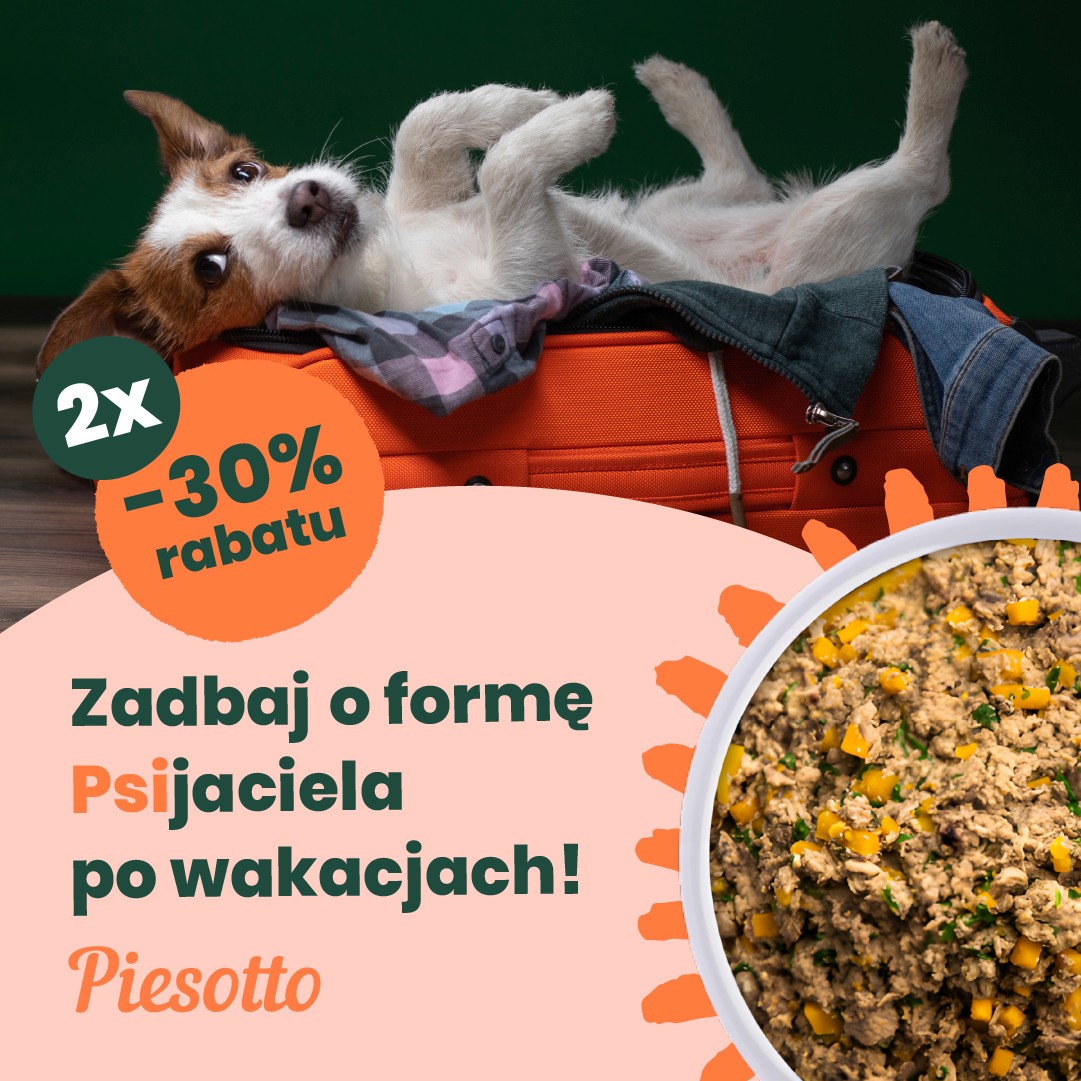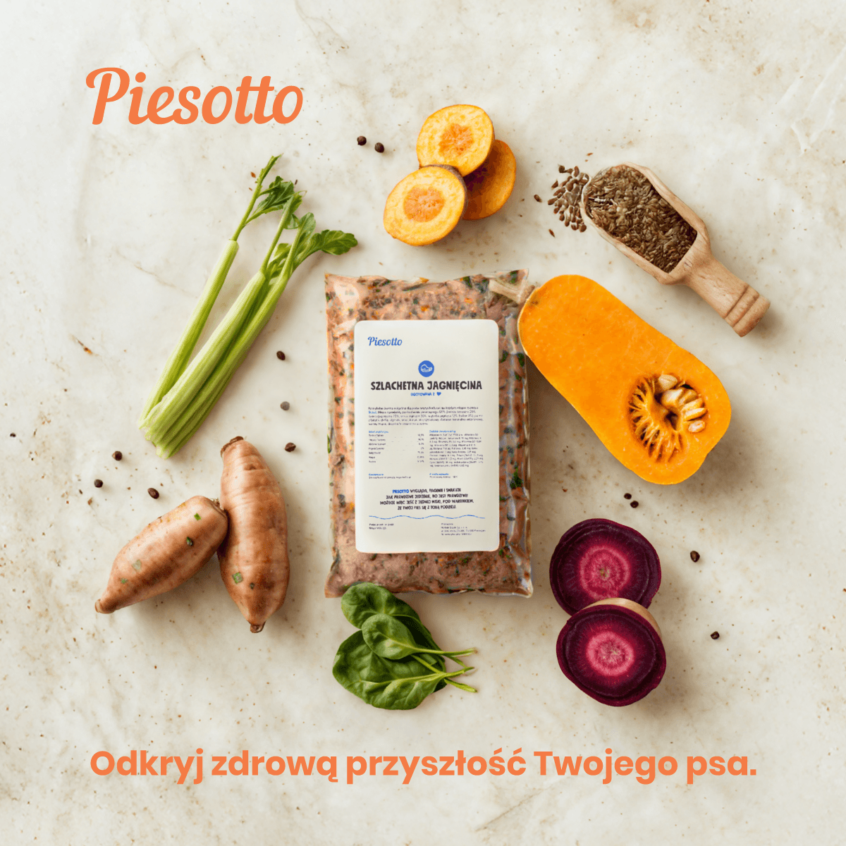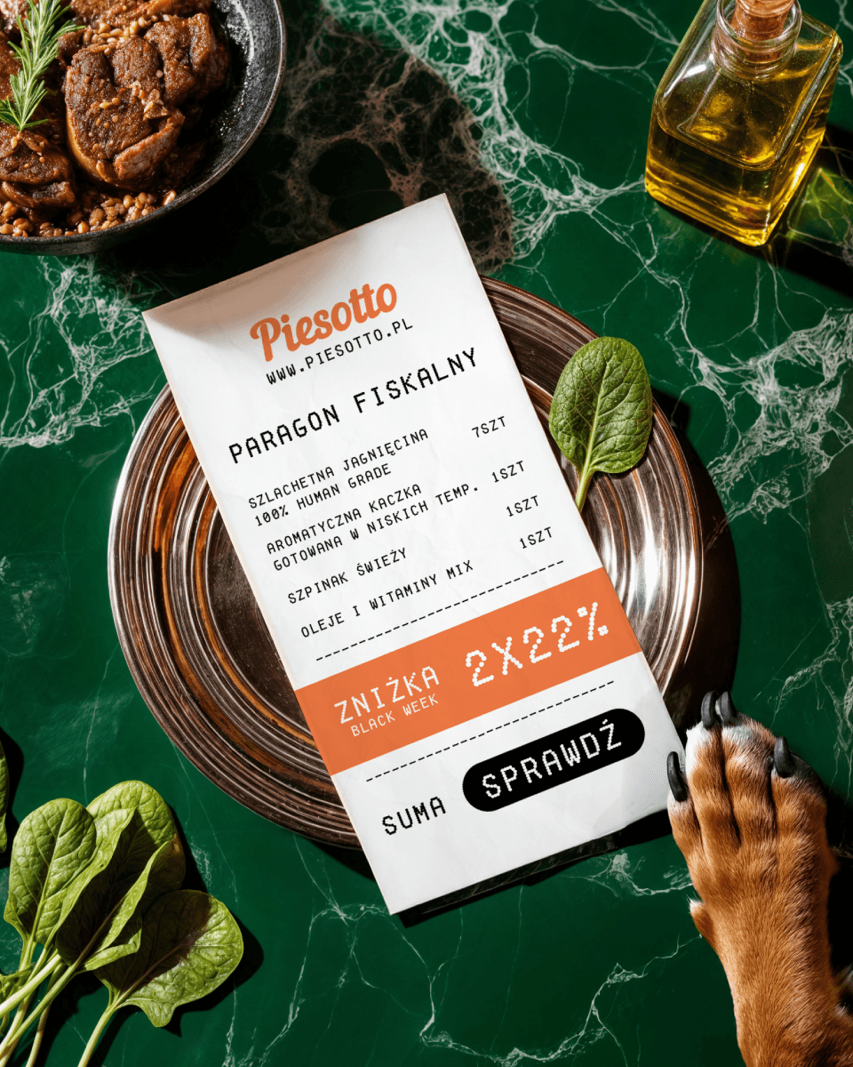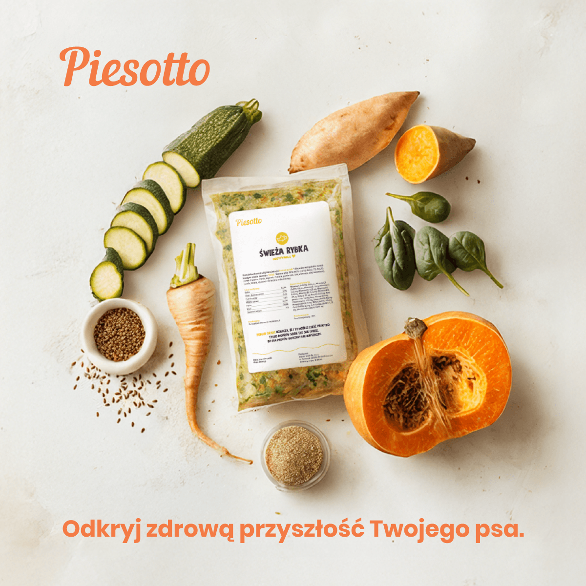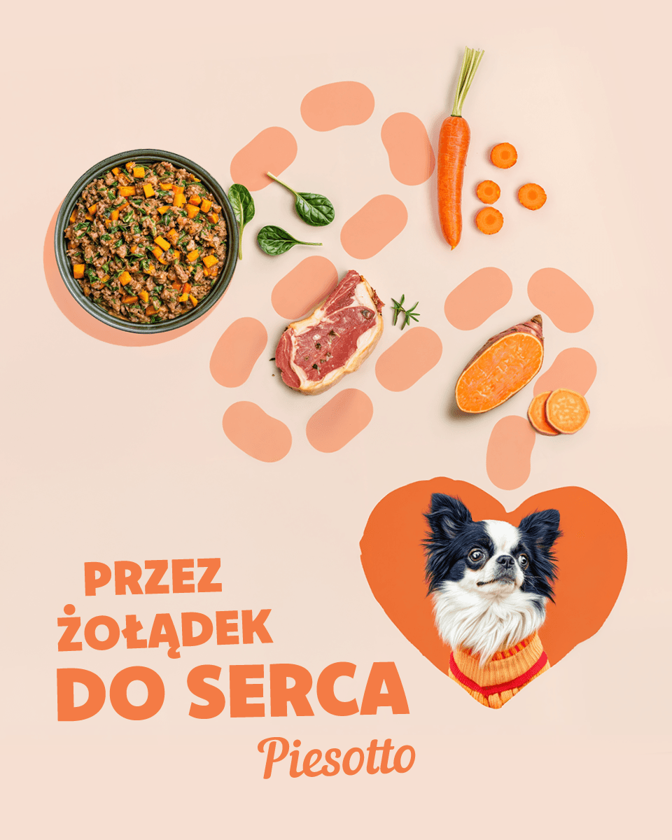 Piesotto — a Polish brand of freshly cooked dog food, delivered in portioned packs and shock-frozen at peak freshness. The product is positioned around simple ingredients and human-grade quality.