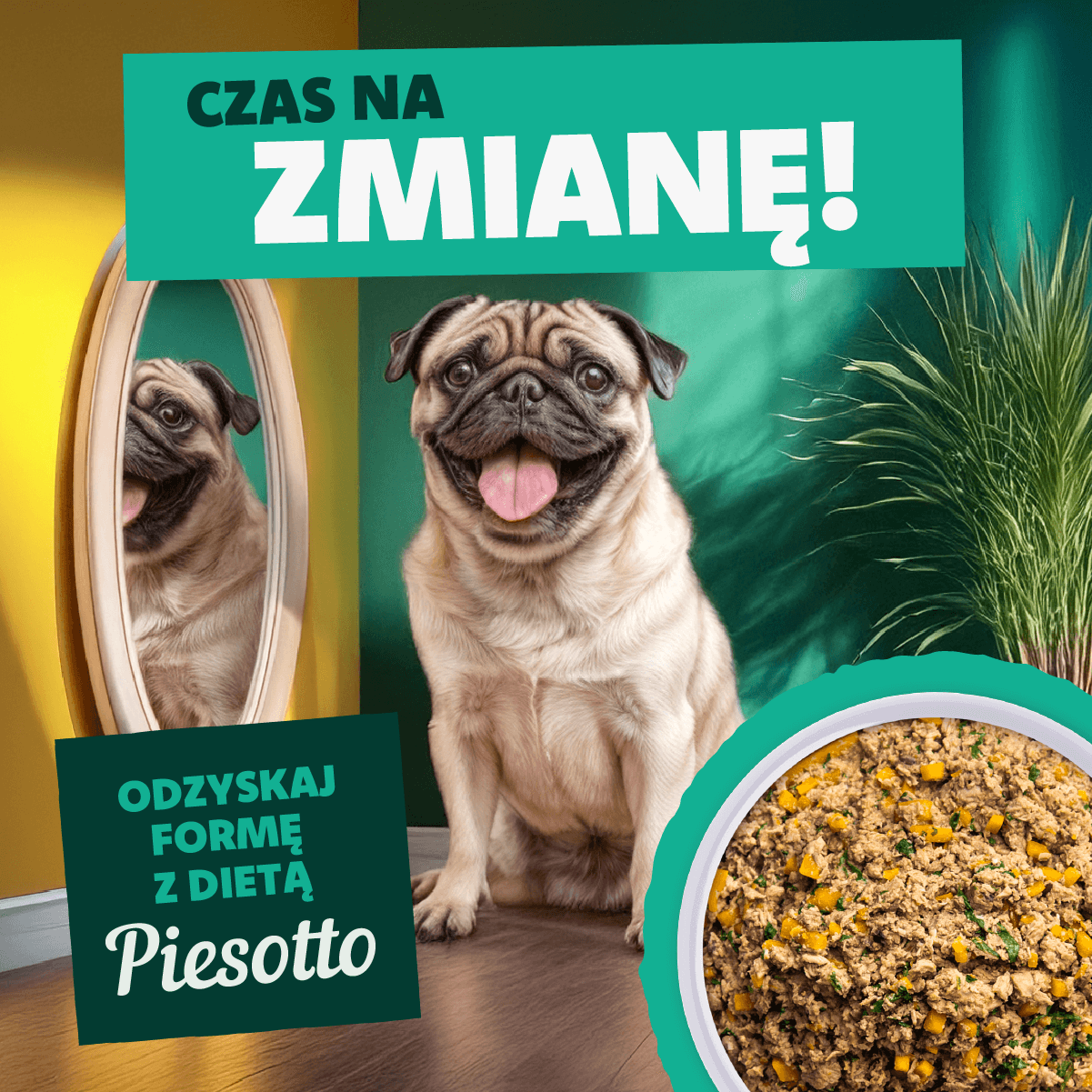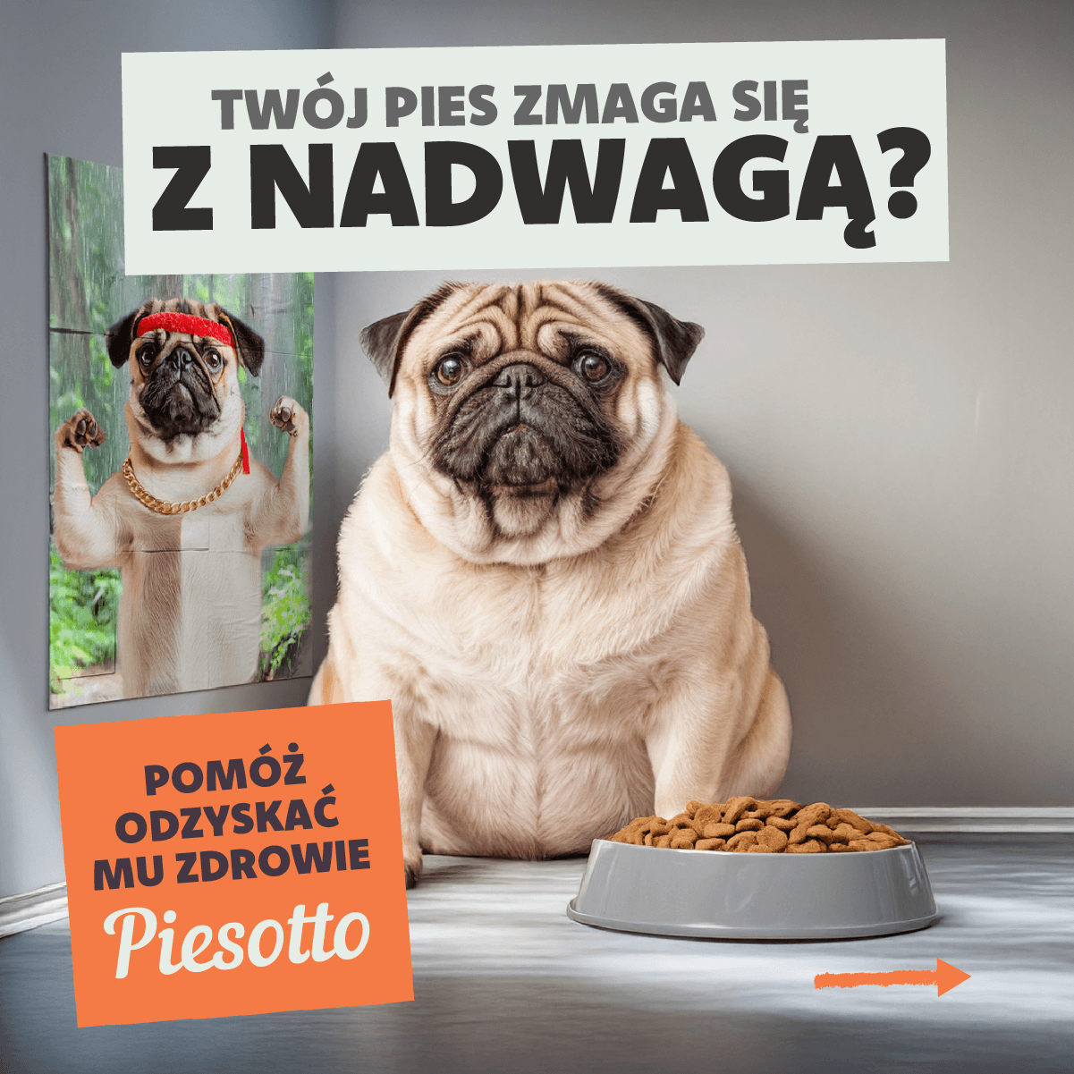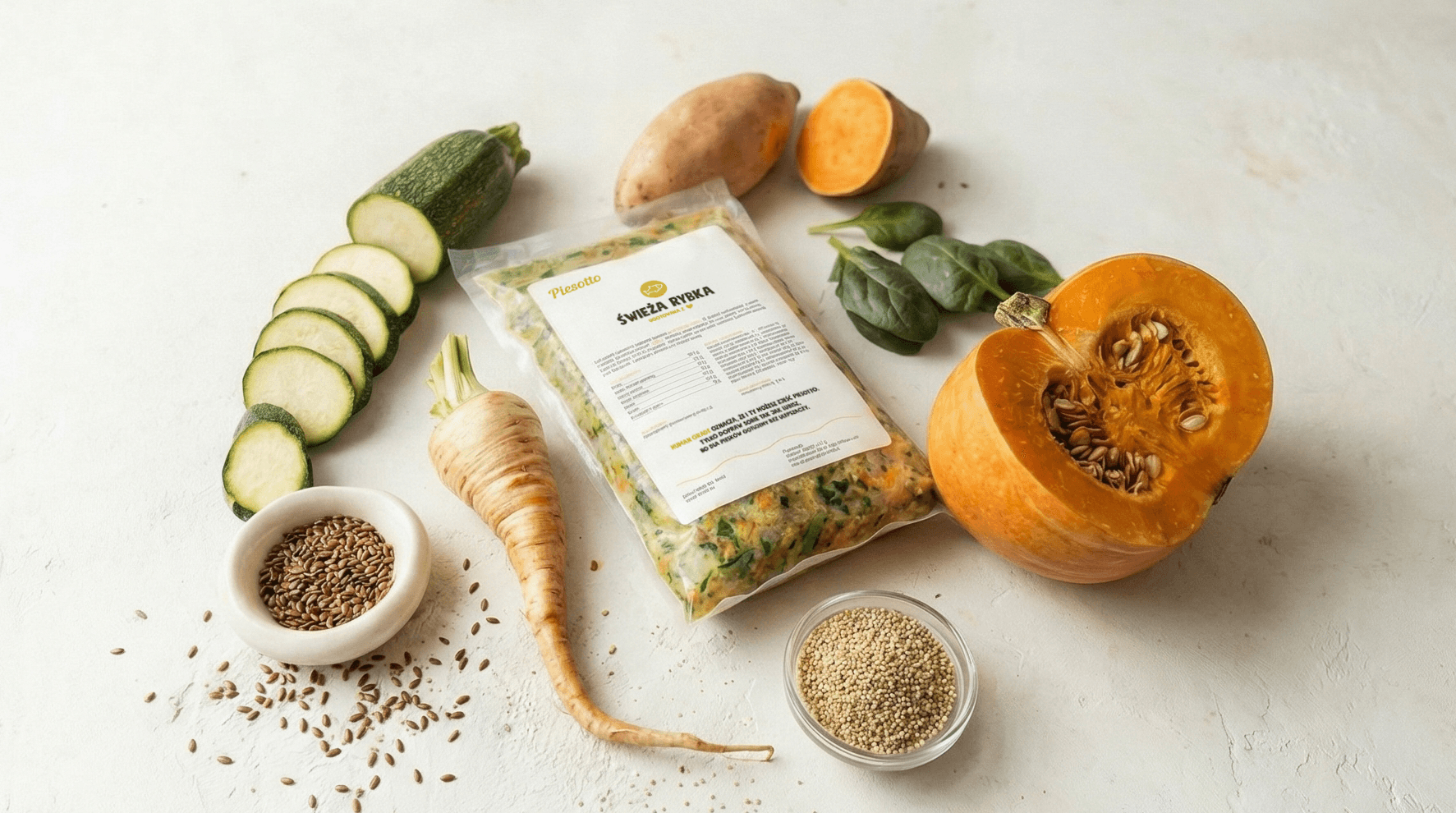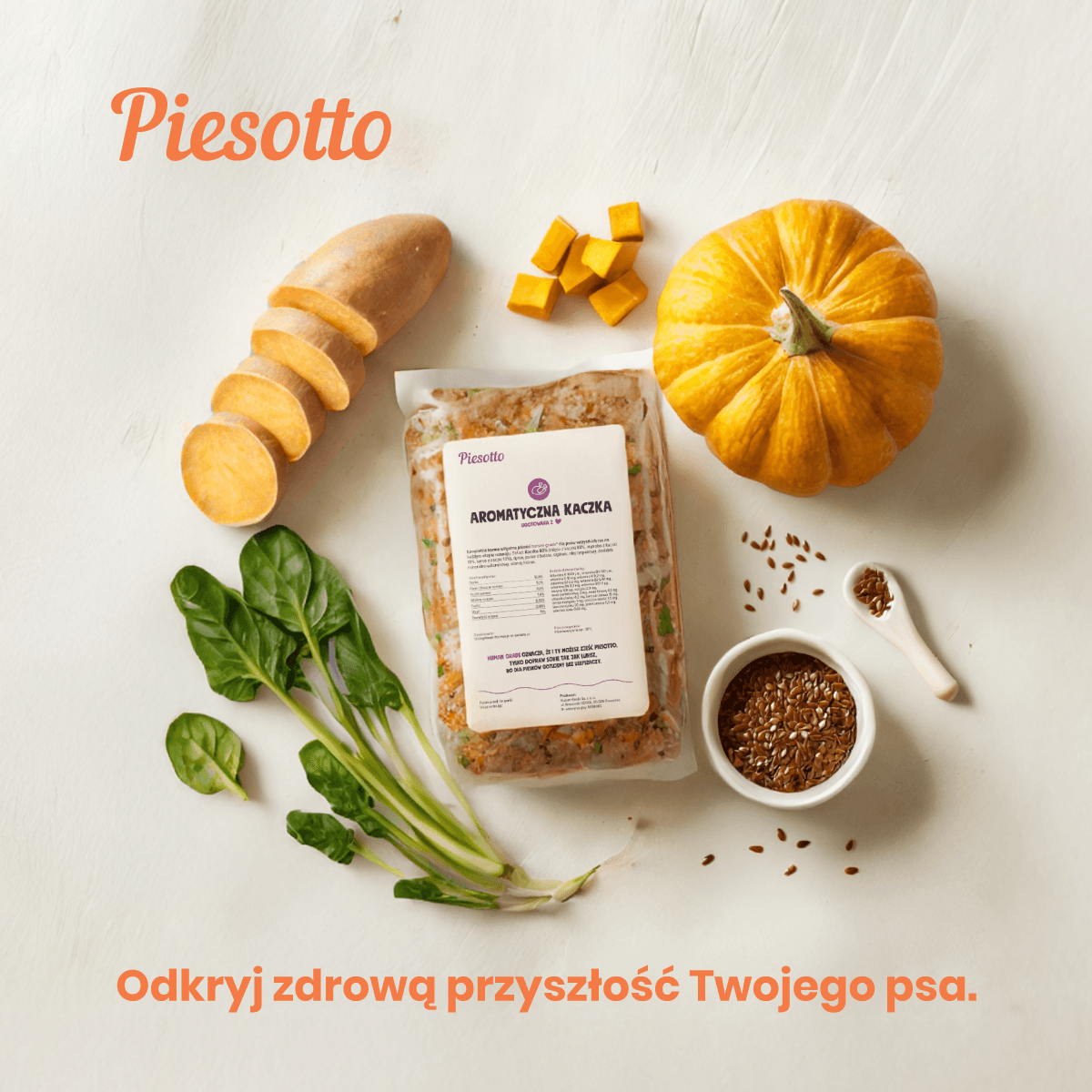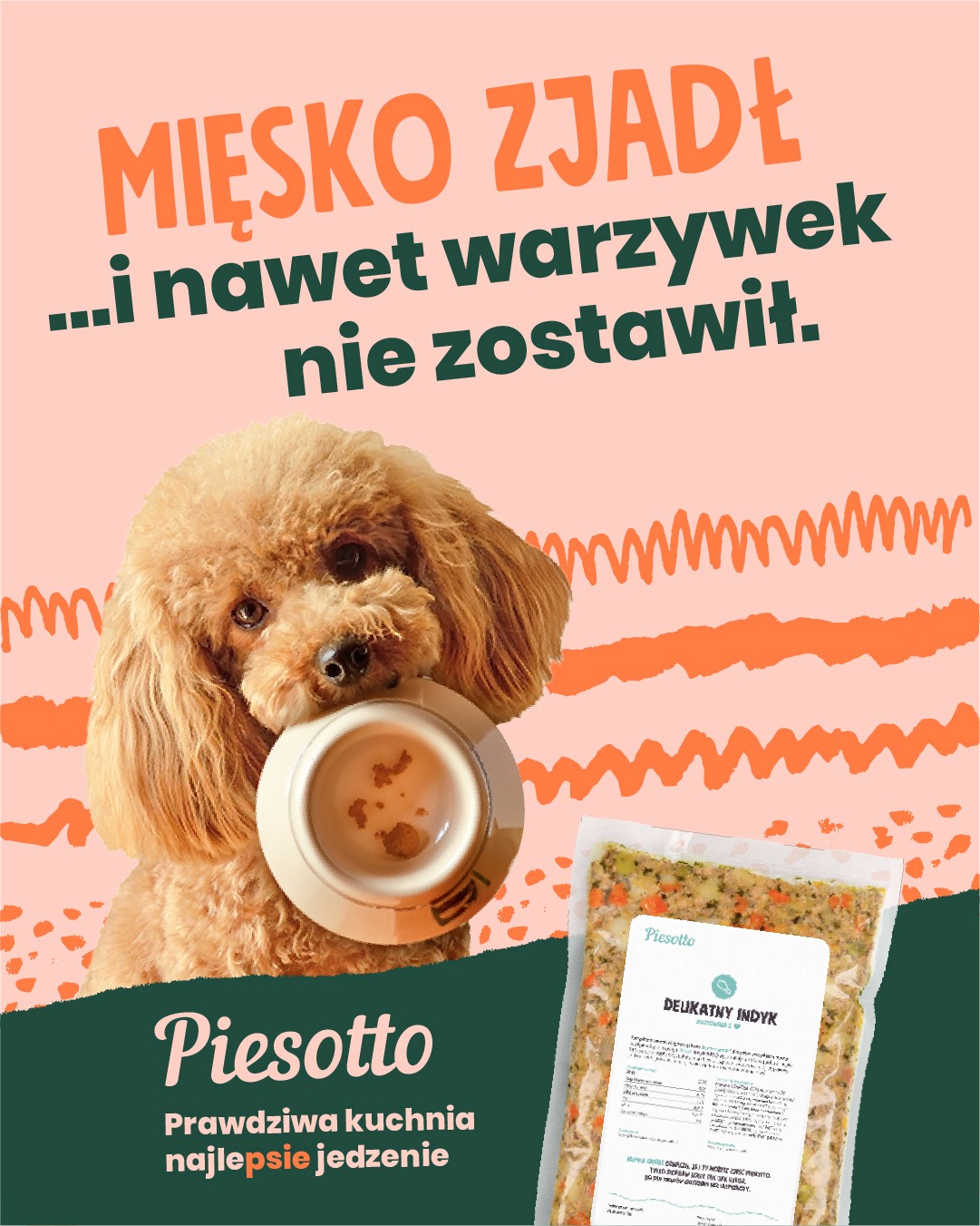 Piesotto — a Polish brand of freshly cooked dog food, delivered in portioned packs and shock-frozen at peak freshness. The product is positioned around simple ingredients and human-grade quality.