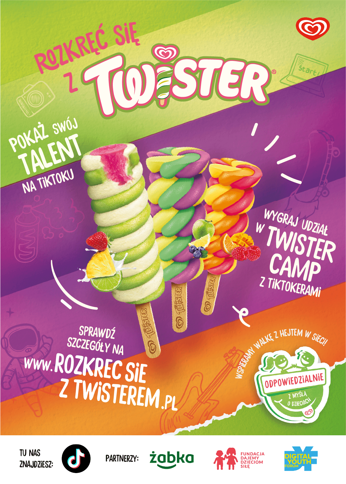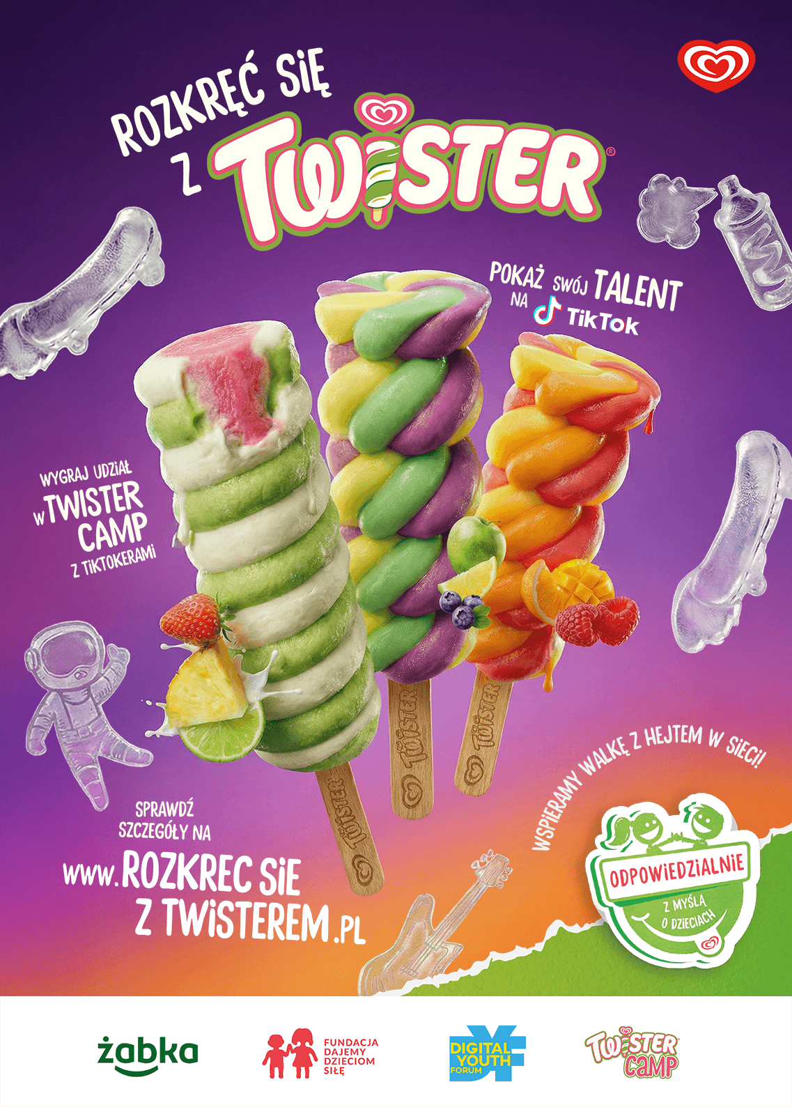 "Twist It Up with Twister" — a TikTok talent contest designed to work for both teens (16+) and parents. The reward was entry to Twister Camp: influencer-led workshops focused on helping young people navigate the online world more safely (including themes around hate and online violence). The activation was amplified across TikTok and broader media (Meta, YouTube, VOD, plus channels like Librus and Blix), with influencers running the challenges on their own profiles.